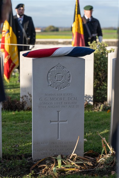 After the war the remains of Serjeant Moore were recovered and buried in Tyne Cot Cemetery as un unknown soldier of the London Rifle Brigade. It was noted that the soldier had received the Distinguished Conduct Medal. As he was missing, Serjeant Moore was commemorated on the Menin Gate. However, new research has shown that this is in fact the grave of Serjeant Moore and the headstone over the grave has been changed to reflect this. During the commemoration on 12 November, we remembered Serjeant Moore Goodson Moore DCM and his grave was rededicated.