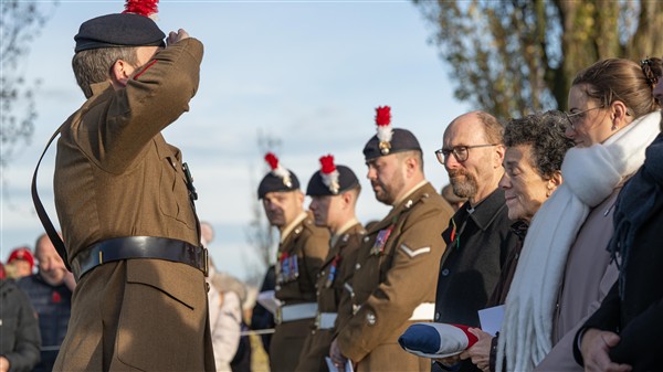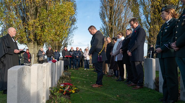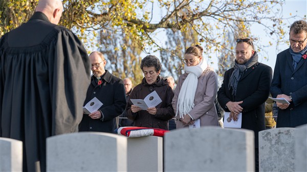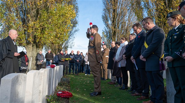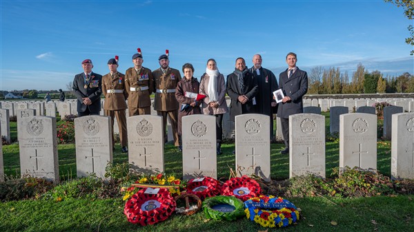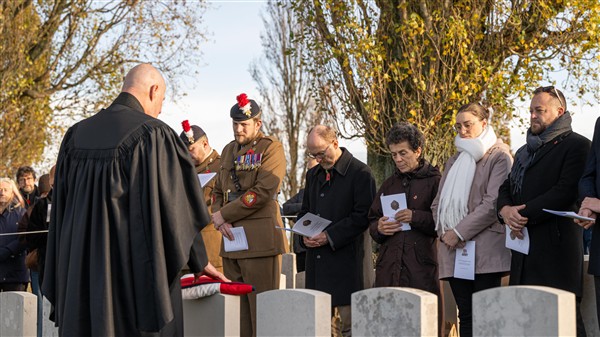 On Wednesday, 12 November 2025, at 9:30 a.m., a ceremony was held at the British Tyne Cot Cemetery in Passchendaele. Sergeant George Goodson Moore DCM was given a new gravestone bearing his name, thanks to research that proved he was indeed buried there.