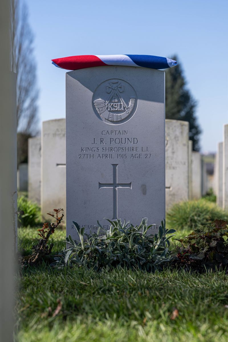 After the war the remains of Captain John Russell Pound were recovered and buried in Tyne Cot Cemetery as an unknown captain of the King's Shropshire Light Infantry. As he was missing, Captain Pound was commemorated on the Menin Gate. However, new research had led to the identification of his grave and the headstone over the grave has now been changed to reflect this. The grave was rededicated on 18 March 2026.