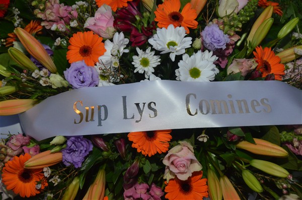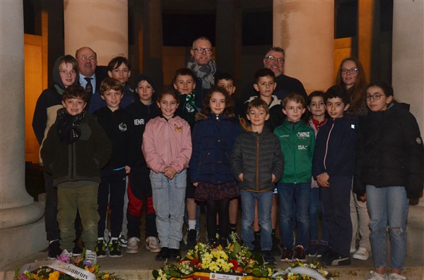 Neerleggen van de kransen, met als eerste burgemeester Alice Leeuwerck van Komen-Waasten.