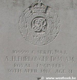 FURLONGER, Company Serjeant Major, A H, A M, D C M, 109599. 29th Light Railway Operating Coy. Royal Engineers. 30th April 1918. Age 31. Son of Mr. A. H. and Mrs. M. J. Furlonger, of 24, Palmerston Rd., Wimbledon, London. III. D. 31. The following particulars are given in "The London Gazette", No. 30,876, dated Friday, 30th Aug., 1918, of the acts for which the Albert Medal was awarded to C.S.M. A. H. Furlonger, D.C.M., Spr. J. C. Farren and Spr. G. E. Johnston who are buried in this Cemetery, as well as to Lce. Cpl. J. E. Bigland and Spr. J. H. Woodman, all of the Royal Engineers :- "In Flanders, on the 30th April, 1918, a train of ammunition had been placed at an ammunition refilling point, and after the engine had been detached, and was being run off the train, the second truck suddenly burst into flames. Furlonger immediately ordered Bigland, the driver, to move the engine back on to the train for the purpose of pulling away the two trucks nearest the engine. Bigland did so without hesitation, and the engine was coupled up by Furlonger, assisted by Farren, while the burning truck was uncoupled from the remainder of the train by Woodman. The two trucks were then drawn away clear of the ammunition dump, it being the intention to uncouple the burning wagon from the engine and the first wagon and so isolate it, with the object of localising the fire as far as possible. The uncoupling was about to be done when the ammunition exploded, completely wrecking the engine and both trucks, killing Furlonger, Farren and Johnston (a member of the train crew), and seriously wounding Bigland. Had it not been for the prompt and courageous action of these men, whereby three of them lost their lives and one was seriously injured, there is not the slightest doubt that the whole dump would have been destroyed and many lives lost".