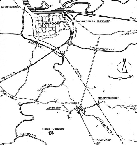 De polder van Nieuwendamme vormt een driehoek met als zijden het Plassendale kanaal en de IJzer die samenkomen in de Ganzenpoot. Waar de oude IJzerbedding de gekanaliseerde IJzer bijna raakt, staat de duiker aangeduid waarover Geeraert het had. Ernaast ziet u de overlaat van de Kreek van Nieuwendamme, een bouwwerk dat op vandaag nog altijd bestaat maar dat in 1914 niet gebruikt werd. De onderwaterzetting van de polder slaagde en we kunnen die gerust de prelude van de ‘grote’ inundatie noemen die enkele dagen later zou plaatsvinden.