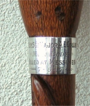 'Recently Arthur's Company Sergent Major's Parade Stick was located in Sydney Australia in the care of another relation..... this had been returned to Dunedin after his 1917 death and his parents had the engraving put onto it.... Its great to be able to bring it back to Messines.... perhaps more posessions of Arthur will come to hand in the years ahead.'