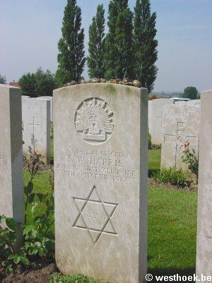 Op 97 grafstenen staat een smal kruis. Alleen op de grafsteen F 7, van Lewis Moses uit Birmingham, staat een davidschild (davidster, jodenster) met daarin vijf Hebreeuwse lettertekens voor een afkorting die we vertalen: zijn ziel ruste in vrede.