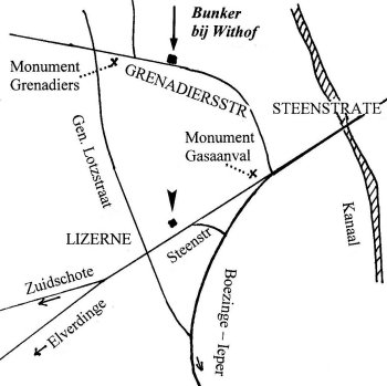 Dat was in de Grenadiersstraat, bij de enige boerderij in die straat, het Withof (bewoond door André en Magda Cappelle-Vandeputte). Die bunker ligt inderdaad vlak bij de straat, weliswaar achter enkele boomstammen 'verscholen'. De Grenadiersstraat is de straat die loopt vanaf het Grenadiersmonument (hoek Generaal Lotzstraat en Grenadiersstraat), richting Steenstrate (uitkomend vlak bij het Gasaanvalmonument (Verzoeningskruis)).